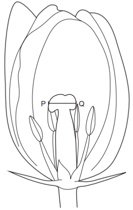 The diagram shows a drawing of part of a tulip flower. The actual width of the stigma, shown by the line PQ, is 5 mm. The length of line PQ is 15 mm.
