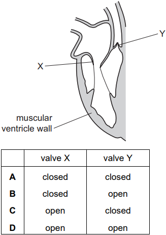 Which row describes the positions of valve X and valve Y when the ventricle contracts?