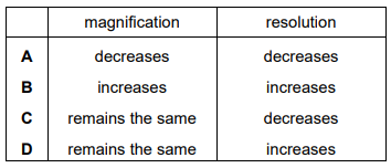 A specimen of plant tissue is observed twice with a microscope, firstly using red light with a wavelength of 650 nm and then using green light with a wavelength of 510 nm.