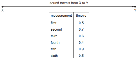 In an experiment to measure the speed of sound, a student uses a stopwatch to find the time taken for a sound wave to travel from X to Y. She does this six times.