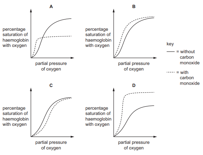 Which graph shows the effect of carbon monoxide on the percentage saturation of haemoglobin with oxygen?