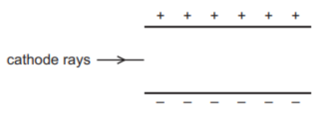 The diagram shows cathode rays entering an electric field between two charged plates.