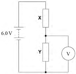 Resistors X and Y are connected in series with a 6.0 V battery of negligible internal resistance.