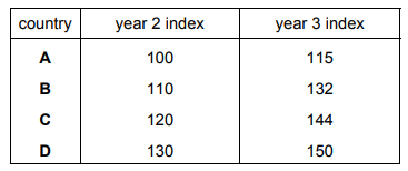 The table shows the retail prices index for four countries for years 2 and 3.