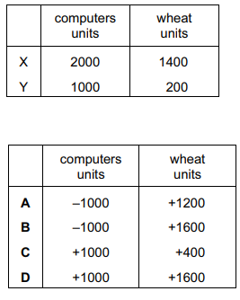Countries X and Y produce the world supply of computers and wheat. Each country divides its resources equally between the two products and produces the following.