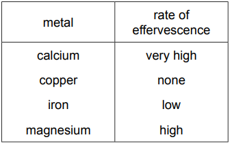 Four different metals are separately mixed with an equal volume of dilute hydrochloric acid.