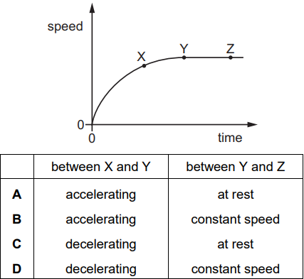 Which row describes the motion of the object between X and Y, and between Y and Z?