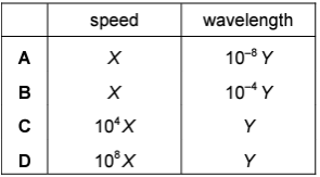 Microwaves in a vacuum travel at speed X and have wavelength of order of magnitude Y.