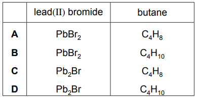 Which row shows the correct formulae of lead(II) bromide and butane?