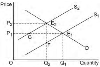 The diagram below shows the market demand curve (D) and two market supply (S$_1$ and S$_2$) curves for a good. The initial equilibrium point is at E$_1$. The introduction by the government of an indirect tax per unit of the good results in a new equilibrium at E$_2$.