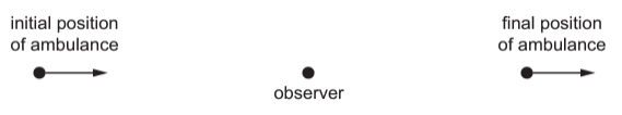 Which overall change in observed frequency takes place between the times at which the ambulance is a long way behind the observer and when it is a long way in front of the observer?