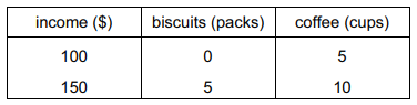 The table shows how an individual’s weekly consumption of biscuits and coffee varies with income.