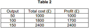 Table 2 shows total costs and profit for different levels of output produced by a firm.