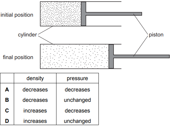 How are the density and the pressure of the gas affected by moving the piston?