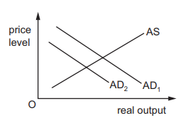 In the diagram, $A{D_1}$ and AS are an economy’s original aggregate demand and aggregate supply curves.