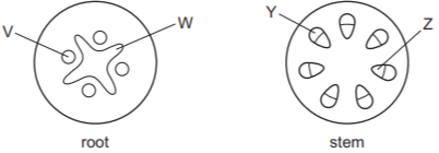V:xylem / W:phloem / Y:xylem / Z:phloem