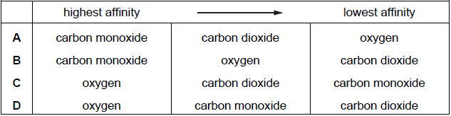 Which row is correct about the affinity between haemoglobin and the gases carbon dioxide, carbon monoxide and oxygen?