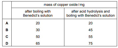 The table shows the mass of copper oxide after boiling with Benedict’s solution and after acid hydrolysis and boiling with Benedict’s solution.