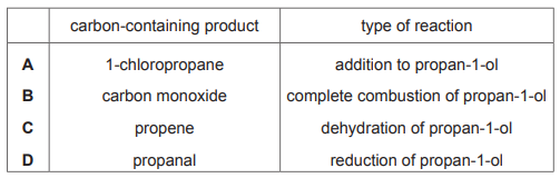 Which row describes the type of reaction that occurs when propan-1-ol reacts to form the named carbon-containing product?