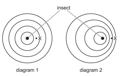 A stationary insect on the surface of water creates circular waves with its legs, as shown in diagram 1. The insect begins to travel to the right as shown in diagram 2.