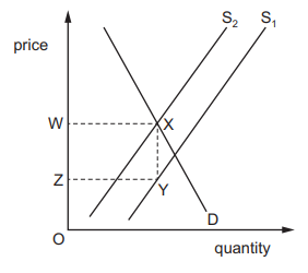 The diagram illustrates the effect of a government action that shifts ${S_1}$ to ${S_2}$.