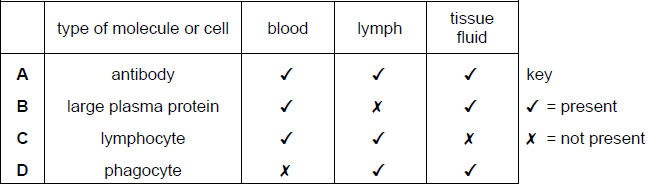 Which row correctly identifies the locations in which a type of molecule or cell is present?