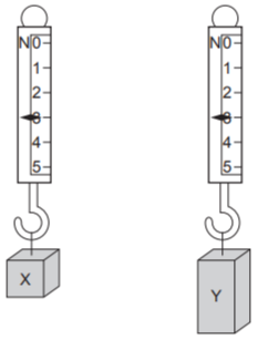 Two blocks of metal X and Y hang from spring balances as shown in the diagram.