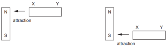 A metal rod XY is placed near a magnet. End X is attracted when it is placed near to the north pole of the magnet, and also when it is placed near to the south pole.
