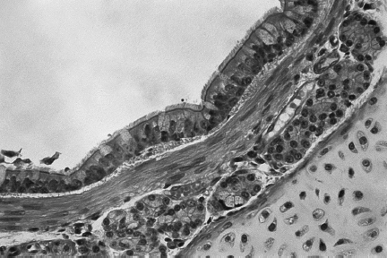 an inner layer of ciliated epithelial and goblet cells on top of loose tissue with mucous glands, supported by a continuous ring of cartilage