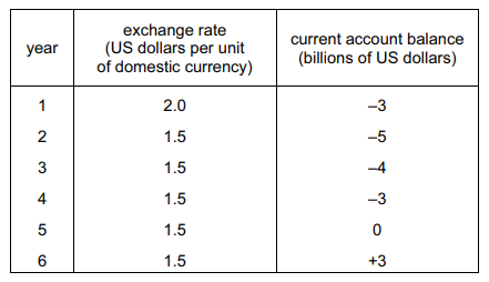 The table shows observations of the exchange rate of an economy and its current account balance over six years.