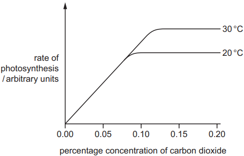 The graph shows the rate of photosynthesis in a plant in full sunlight at two different temperatures and different concentrations of carbon dioxide.