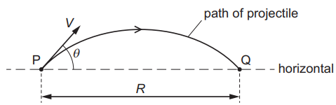 A projectile is fired from point $P$ with velocity $V$ at an angle θ to the horizontal. It lands at point $Q$, a horizontal distance $R$ from $P$, after time $T$.