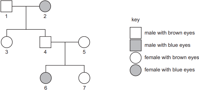 The diagram shows a family tree for the inheritance of eye colour. The allele for brown eyes is dominant and the allele for blue eyes is recessive.