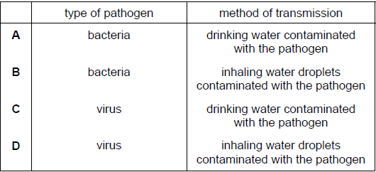 Which row identifies both the type of pathogen that causes cholera and the way in which cholera is transmitted from person to person?