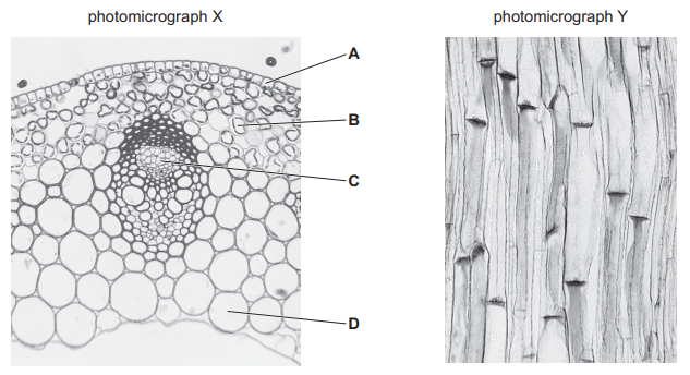 Photomicrograph X shows a transverse section through a typical stem. Photomicrograph Y shows a longitudinal section through one type of cell shown in photomicrograph X.