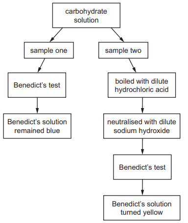 A student was provided with a solution of carbohydrate. They removed two samples from the solution and performed tests on each sample, as shown.