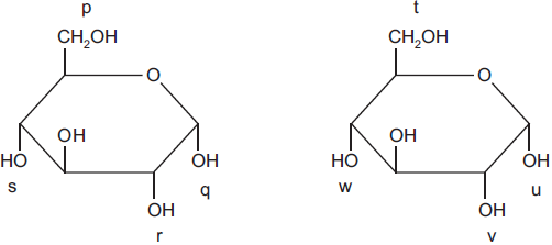 The diagram shows two molecules of glucose. Four possible bonding positions are labelled p, q, r, and s, and t, u, v, w.