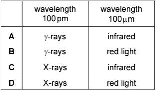 What are the names of the electromagnetic waves that have wavelengths in a vacuum of 100 pm and of 100 µm?