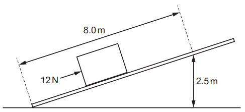 The diagram shows a force of 12 N being used to push a box up a slope. The box is moved 8.0 m along the slope. This lifts the box through a vertical height of 2.5 m.