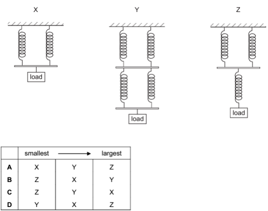 A number of similar springs, each having the same spring constant, are joined in three arrangements X, Y and Z. The same load is applied to each.