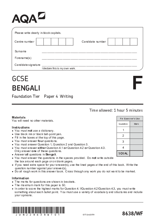The document is a GCSE Bengali Foundation Tier writing exam assessing language skills and cultural understanding. It includes:- Basic Descriptions: Focuses on students writing about personal preferences and daily routines using simple Bengali vocabulary.