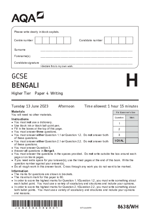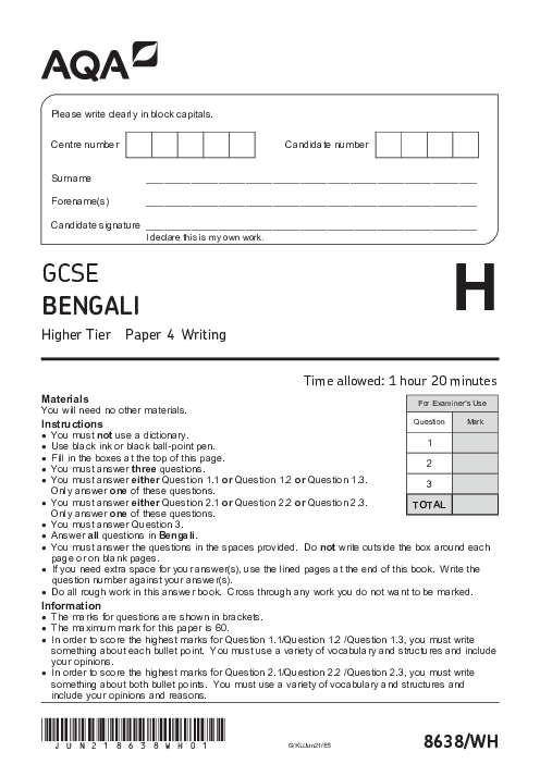 The document is the mark scheme for the GCSE Bengali Higher Tier Speaking Paper (June 2022). It outlines scoring criteria for three main sections: role-play, photo card discussion, and general conversation. Emphasis is placed on assessing communication, language accuracy, pronunciation, and fluency. Key evaluation areas include providing opinions, using varied linguistic structures, addressing cultural and societal themes, and demonstrating spontaneity. Marking guidelines highlight expected levels of response, repair strategies, and justifications. Keywords: GCSE Bengali, speaking assessment, cultural themes, linguistic accuracy, fluency, communication skills, pronunciation, spontaneous interaction.